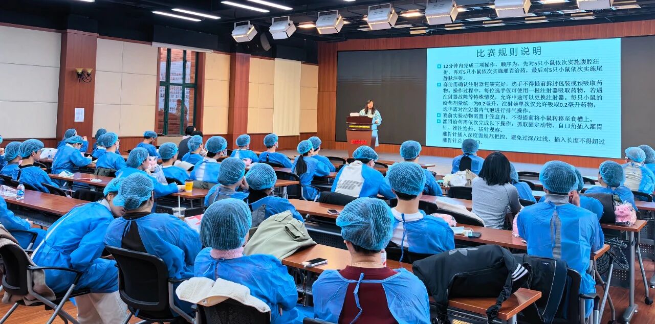 学会副理事长闫明霞主持活动并担任裁判长,向选手们详细介绍了比赛要求和评分规则。本次比赛聚焦实验动物核心操作技能,设置实验小鼠腹腔注射、灌胃给药、尾静脉注射三大实操项目,全面考察参赛人员的操作规范性、熟练度与动物福利保护意识。